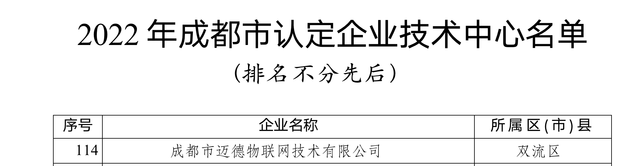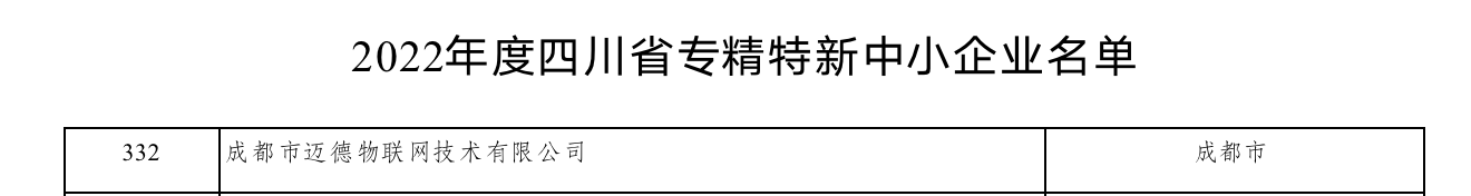 近日,四(si)川省經濟和(he)信息(xi)(xi)化廳發(fa)布(bu)(bu)的《2022年度四(si)川省專精特新中小企(qi)業名(ming)單》、成都市(shi)經濟和(he)信息(xi)(xi)化局發(fa)布(bu)(bu)的《2022年成都市(shi)認定企(qi)業技術中心名(ming)單》中,成都市(shi)邁德物聯網技術有(you)限(xian)公(gong)司(si)皆(jie)在公(gong)布(bu)(bu)名(ming)單中,順(shun)利通(tong)過認定。
